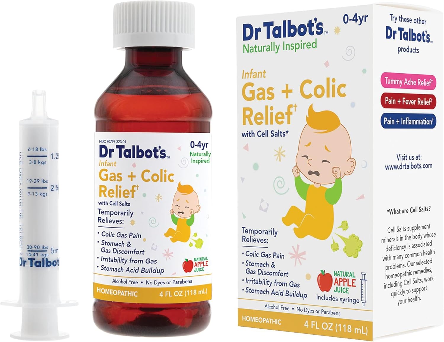 - Formulated with a combination of homeopathic ingredients and cell Salts, Dr. Talbot’s Gas + colic relief quickly relieves tummy troubles for your little one. Tasty and fast acting, you’ll love how quickly your child feels better.